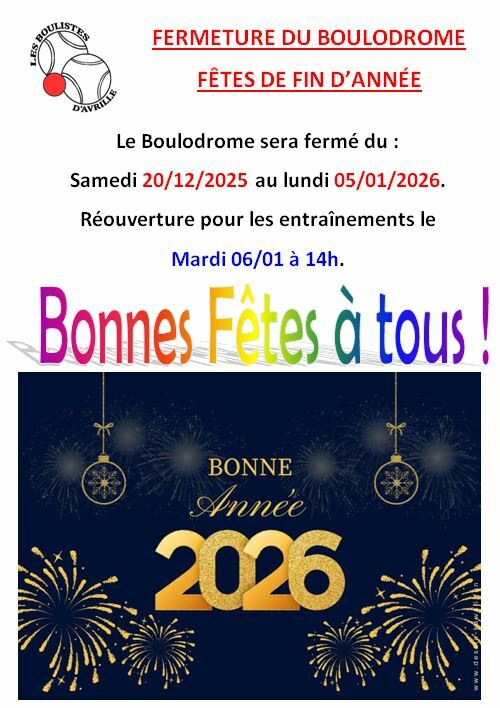 Le boulodrome sera fermé du samedi 20/12 au lundi 05/01/2026.